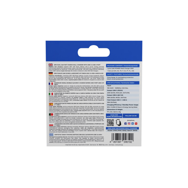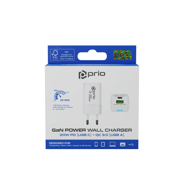 Prio Type-C GaN Powered Wall Adapter 20W PD (USB-C) & QC 3.0 (USB-A) White