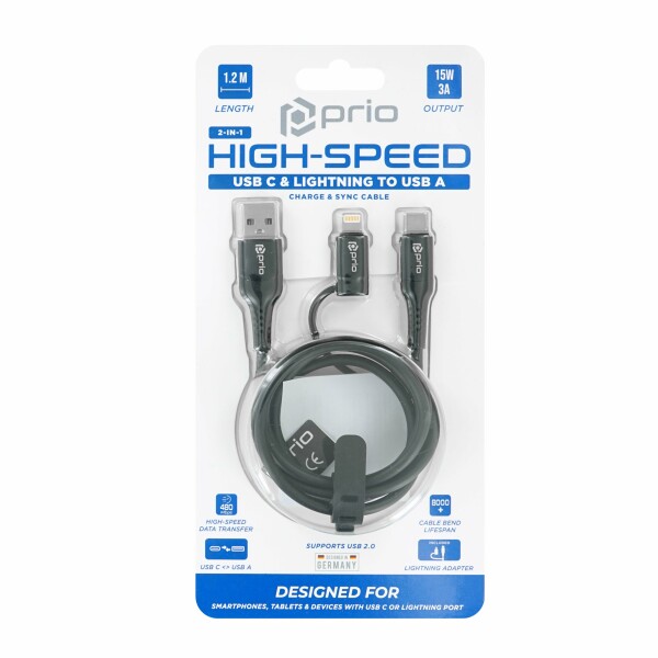 Prio 2 in 1 Charge & Data USB C & Lightning to USB A Cable 3A 1.2m black